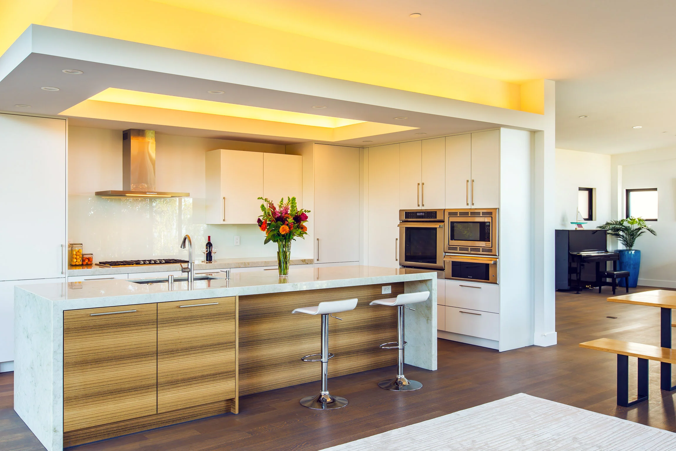 Complete teardown of an existing house on a hillside site in the hills of Burlingame. The client came to us with the stated desire of a modern "butterfly" roof. Public space is located to the East/Downhill side, private space to the West/Uphill side. Communal room overlooks a view of SFO and San Francisco. The Kitchen and Master Suite Office are adjacent to the pool. In association with Dreiling Terrones Architecture (DTA).